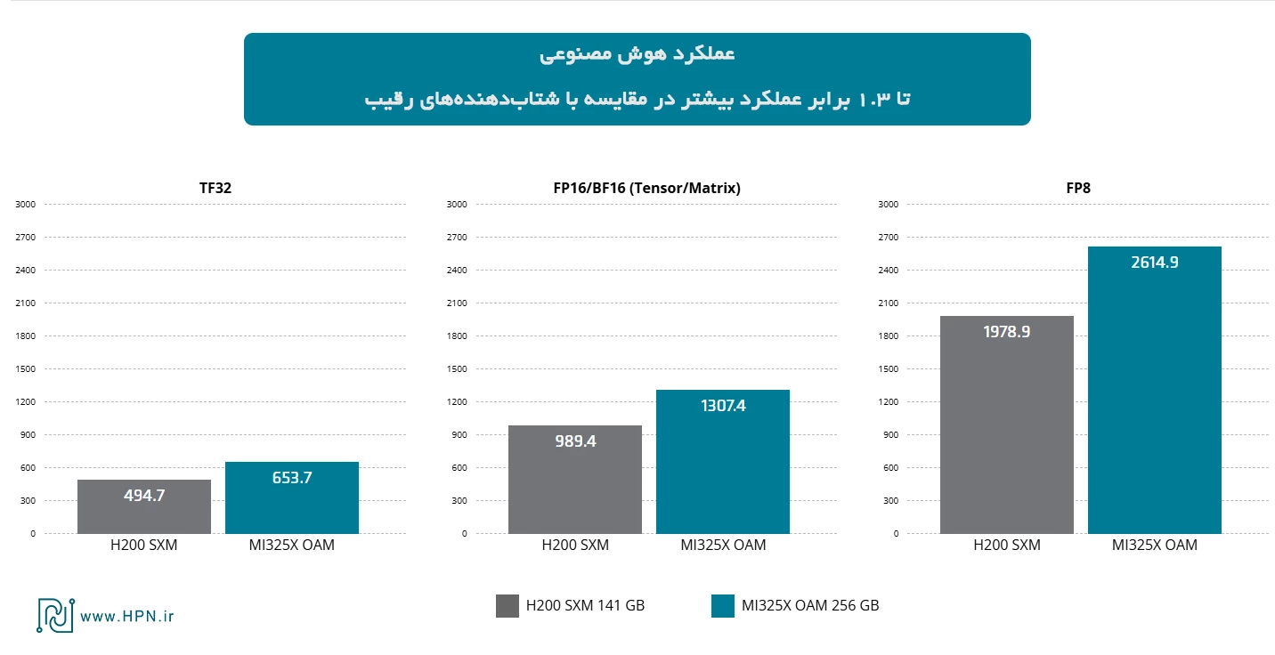 کارت گرافیک AMD Instinct MI325X تا ۲.۴ برابر عملکرد بیشتر نسبت به رقبا در پردازشهای HPC ارائه میدهد و با توان محاسباتی ۱۶۳.۴ TFLOPs استاندارد جدیدی در آموزش و استنتاج مدلهای هوش مصنوعی ایجاد میکند.